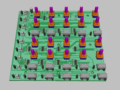 I made my own PCB design in DipTrace to fit the Raspberry Pi Board with all components and connectors. The sketch for the front panel was done in Inkscape. I was able to include within the design 20 potentiometers (ALPS RK11K), 24 tactile key switches (Marquardt 6450 and Omron B3F), red-green bicolor LEDs (Kingbright WP115) for each button, MIDI out and footswitch connectors. The analog inputs are connected using three 74HC5041 multiplexers, digital inputs use 74HC165 parallel shift registers and outputs use 74HC595 serial shift registers. I'm running the LEDs at very low current (<5mA) to make sure I'm not exceeding the RPi 300mA limit when all 48 channels are lit at the same time. Have a look at my preview renderings: