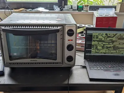 I ordered the PCB at Beta Layout and did the SMD component soldering using the Beta Layout Reflow Kit. This kit is basically a low-cost consumer pizza oven [sic!] with a modified temperature control, so it can match the temperature curve needed for reflow soldering. The result was very satisfying, and I didn't need to do any manual corrections. The THT components were soldered manually, and you can imagine it took me quite some time to get the LEDs sit at the right height.