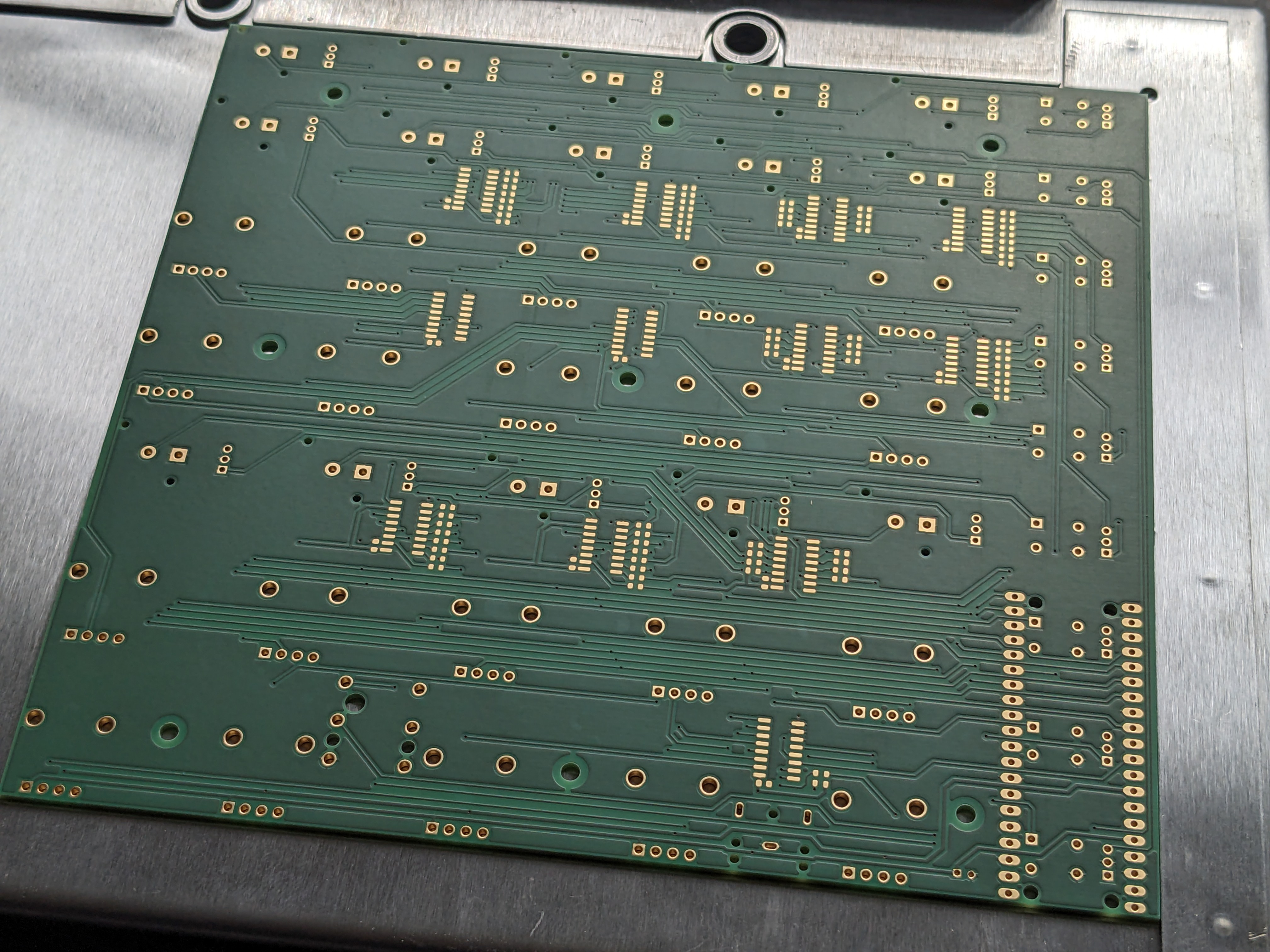 The most challenging part was to find a compact and robust housing that fits my size requirements and is not too expensive to build as a prototype from ground up. I found the U-housing script for the Schaeffer AG Frontpanel Designer, which generates a template for two aluminium plates that can be bent and mounted into a 6-sided box. I transferred my front panel design from Inkscape and needed to take care of overlapping components on the PCB with the mounting brackets. In the end, I found this to be the most cost efficient way and it still looks very professional.
