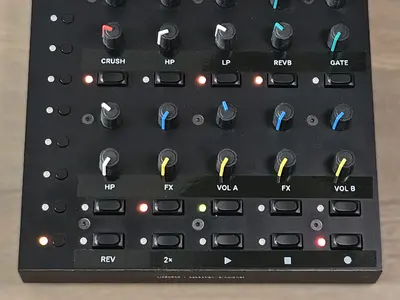 After dismantling my 2003 MIDIBox I wanted to build a successor controller for my Live Set. This time, it needed to be more simplistic and it should come in a synthesizer-style layout, with at least 8 groups of LED-lit buttons and two potentiometers each – I don't like the haptics of encoders while performing. I wanted it to be as versatile as possible with a small footprint of 20x20x5cm maximum.