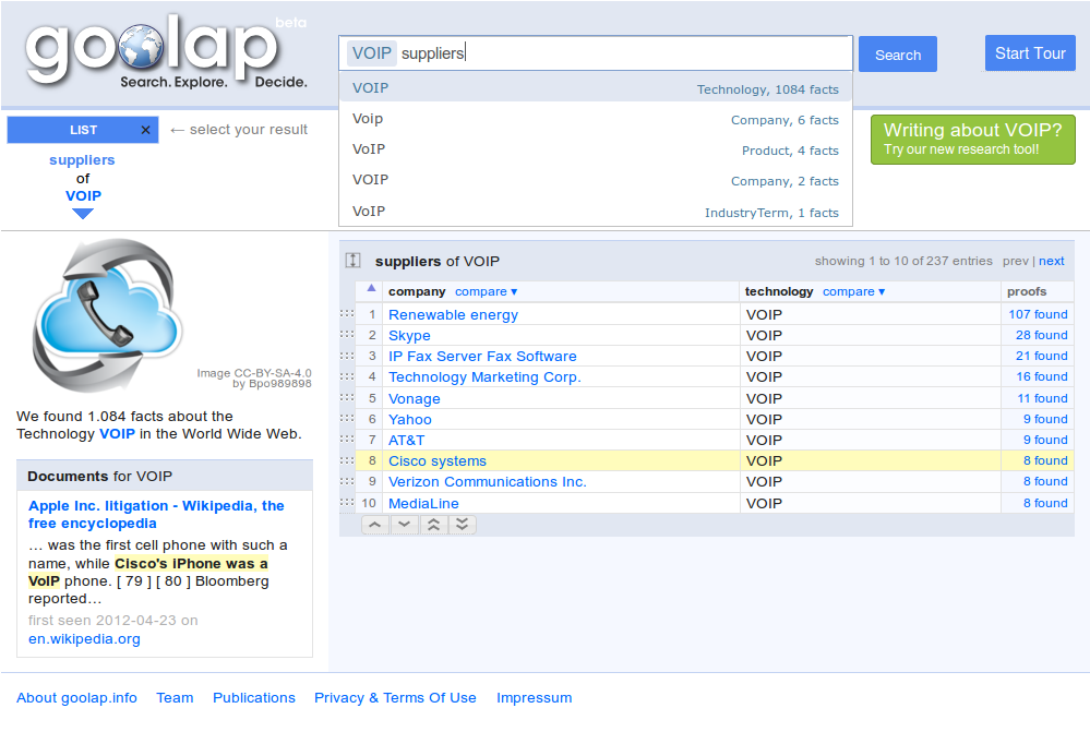 - Alexander Löser, Sebastian Arnold and Tillmann Fiehn: The GoOLAP Fact Retrieval Framework. Lecture Notes in Business Information Processing Vol 96, Business Intelligence. Springer Berlin Heidelberg, 2012: 84–97 [PDF] [demo]