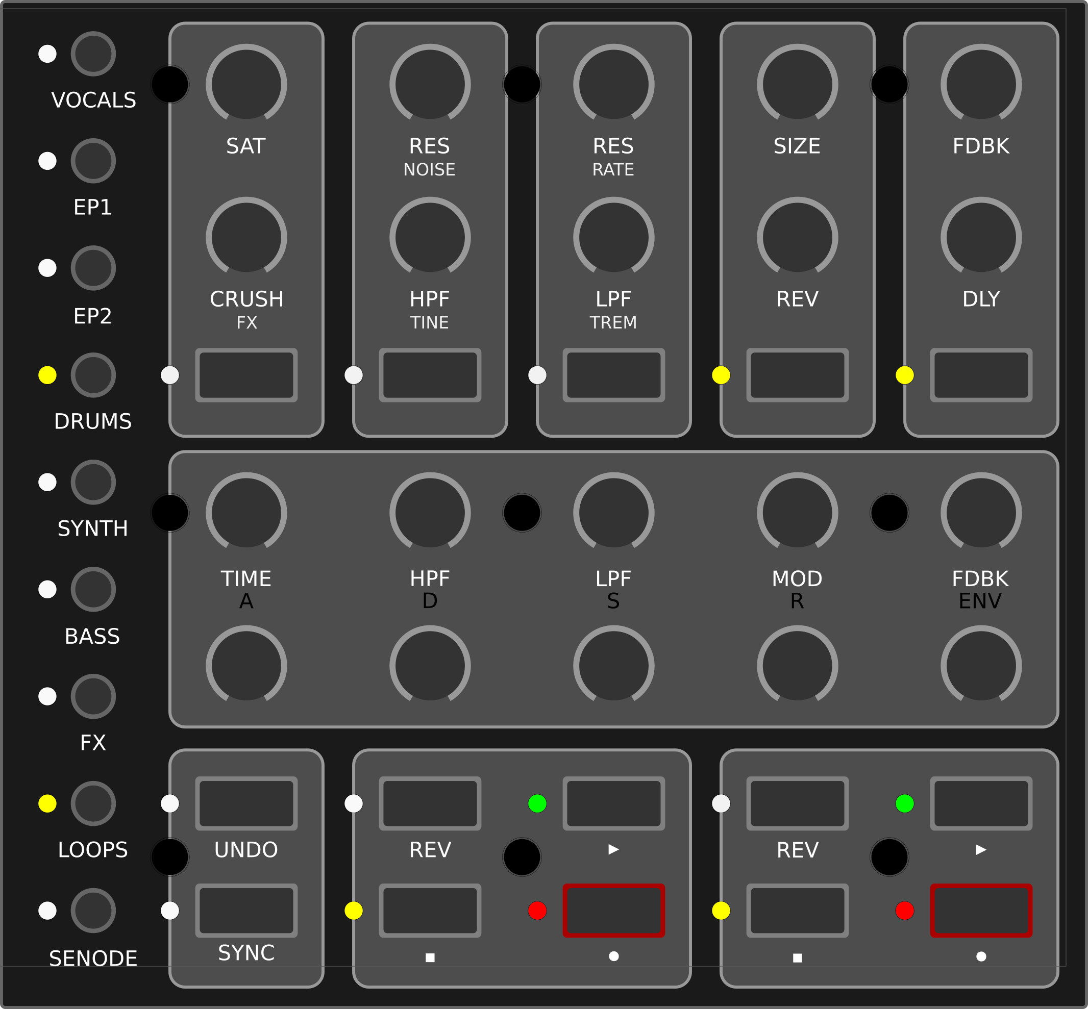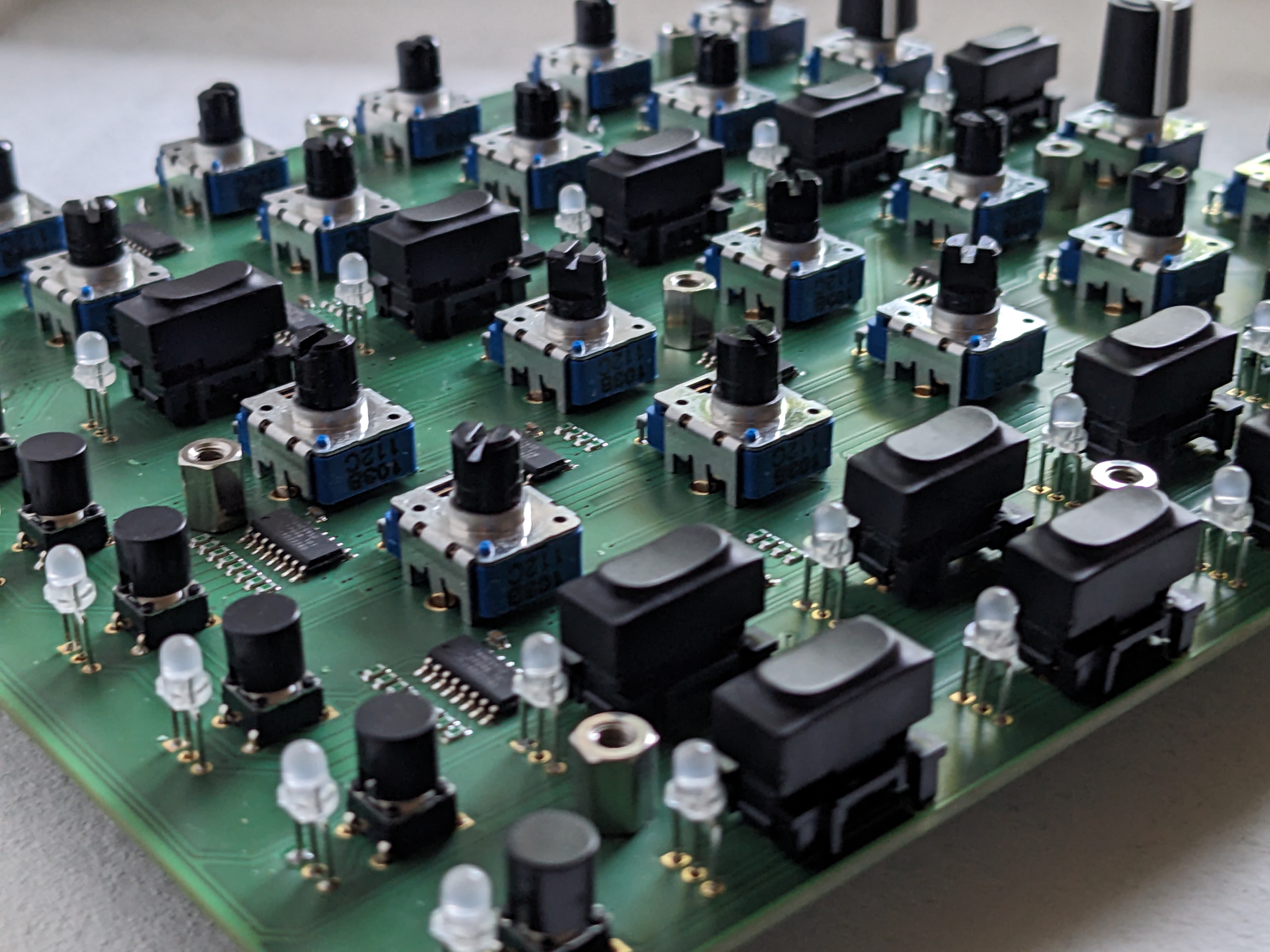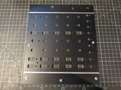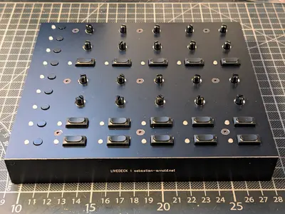 After dismantling my 2003 MIDIBox I wanted to build a successor controller for my Live Set. This time, it needed to be more simplistic and it should come in a synthesizer-style layout, with at least 8 groups of LED-lit buttons and two potentiometers each – I don't like the haptics of encoders while performing. I wanted it to be as versatile as possible with a small footprint of 20x20x5cm maximum.