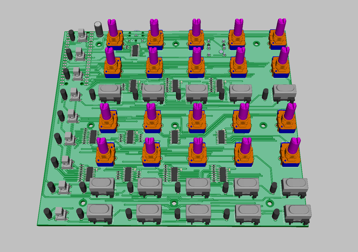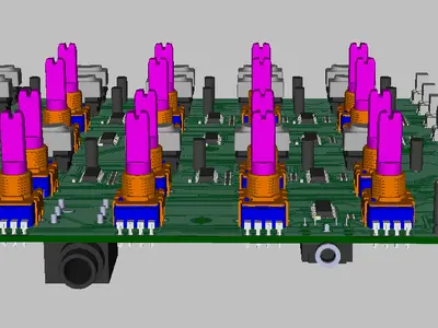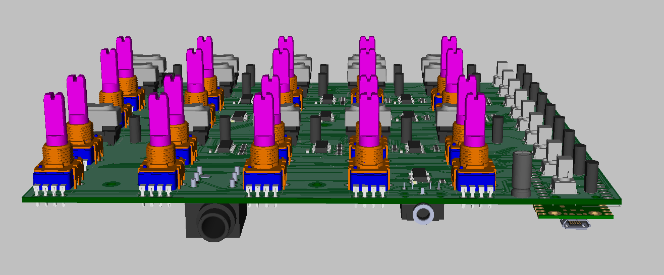I made my own PCB design in DipTrace to fit the Raspberry Pi Board with all components and connectors. The sketch for the front panel was done in Inkscape. I was able to include within the design 20 potentiometers (ALPS RK11K), 24 tactile key switches (Marquardt 6450 and Omron B3F), red-green bicolor LEDs (Kingbright WP115) for each button, MIDI out and footswitch connectors. The analog inputs are connected using three 74HC5041 multiplexers, digital inputs use 74HC165 parallel shift registers and outputs use 74HC595 serial shift registers. I'm running the LEDs at very low current (<5mA) to make sure I'm not exceeding the RPi 300mA limit when all 48 channels are lit at the same time. Have a look at my preview renderings: