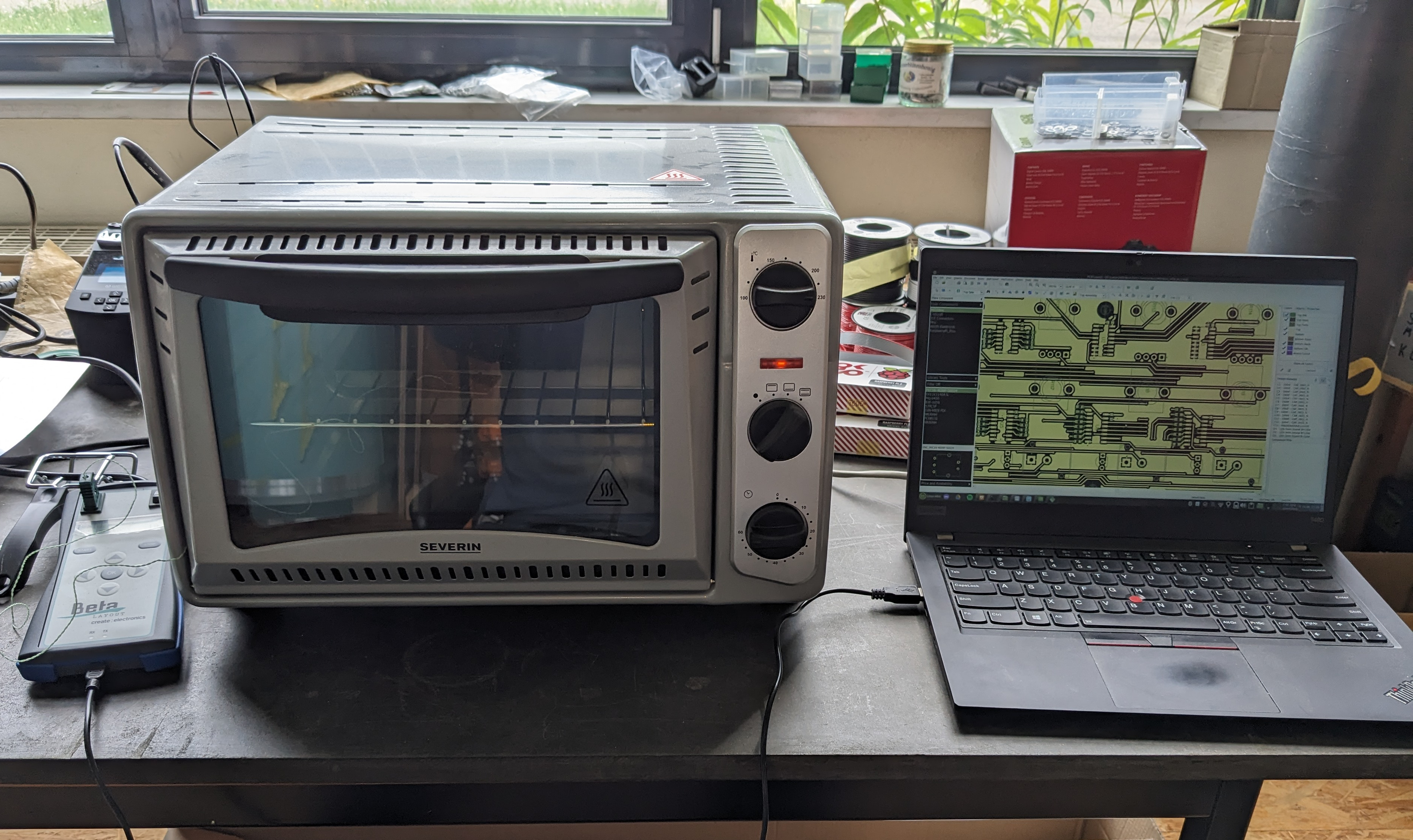 I ordered the PCB at Beta Layout and did the SMD component soldering using the Beta Layout Reflow Kit. This kit is basically a low-cost consumer pizza oven [sic!] with a modified temperature control, so it can match the temperature curve needed for reflow soldering. The result was very satisfying, and I didn't need to do any manual corrections. The THT components were soldered manually, and you can imagine it took me quite some time to get the LEDs sit at the right height.